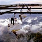 收盐劳动是晒制晶盐的最后一部,海水经过蒸发浓度越来越大,形成了盐的晶体,盐工们把它们收拢在一起,用盐箕挑往岸上的盐场。